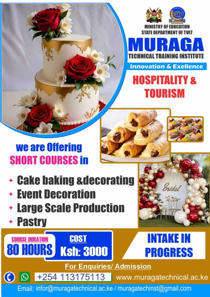 Through well-equipped training kitchens, restaurants, and experienced instructors, the Hospitality Department promotes professionalism, discipline, and continuous improvement. In line with the mission of Muraga TTI, the department upholds integrity and excellence in training while empowering trainees with market-driven skills that contribute to the growth of the hospitality and tourism sector in Kenya.